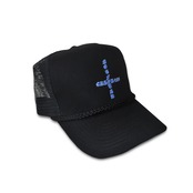 深い被りでフィット感があり、メッシュ素材で通気性も抜群です。青と白のロゴがブラックのキャップに映えて、目を引くデザインです。カジュアルにもアクティブにも着こなせる、機能性とファッション性を兼ね備えたキャップです。